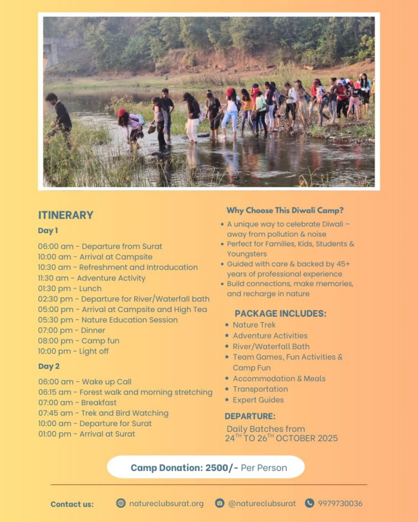 10Oct By Nature Club Surat03/10/2025Camp, Education, Environment Diwali Nature Camp 2025 Diwali Nature camp 2025 ...Registration started...hurry up..